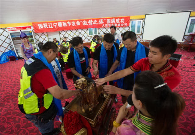 下午6点队员们到达晚宴。蒙古包的主人举行了充满蒙古特色的全羊仪式,并给车手客人们献上了圣洁的哈达。